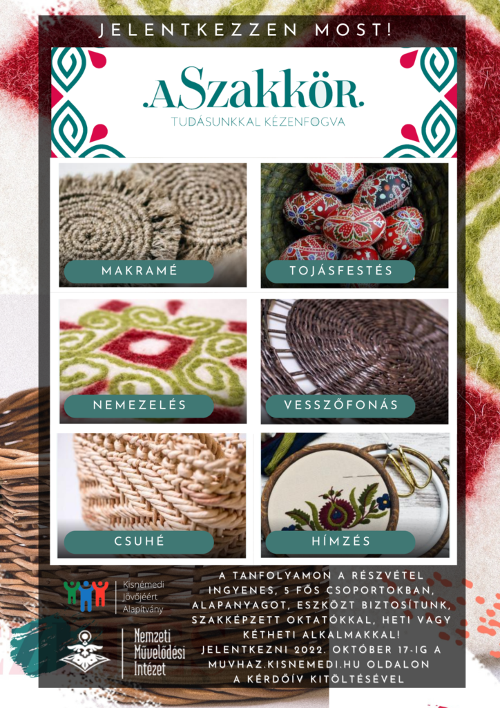A Nemzeti Művelődési Intézet közreműködésével idén is elindítjuk Szakköri foglalkozásainkat. A szakköröket minden esetben felkészült, hozzáértő oktatókkal tartjuk, max 5-6 fős csoportokban. Az alapanyagok egy részét és a helyszínt biztosítjuk. A foglalkozások várhatóan október végén indulnak, heti vagy kétheti periódusban, maximum 20 alkalommal. A foglalkozások végén az elkészített művekből kiállítást tartunk.